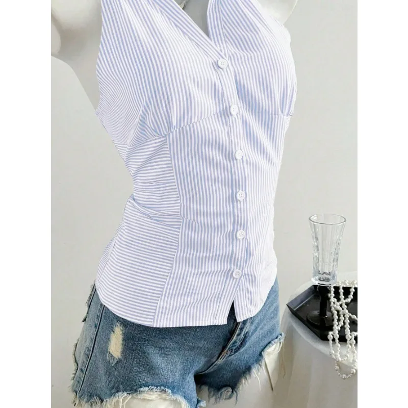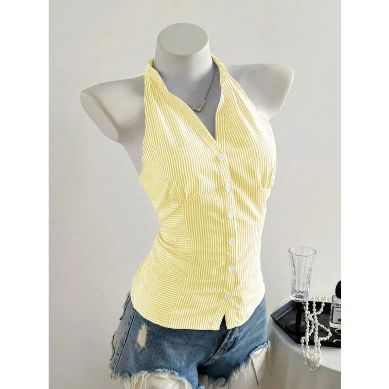 2025 Sexy Fashion Causal Stripe V Neck Sleeveless Holiday Design Plaid Skinny Halter Women Tank Chic Holiday Streetwear Tanks