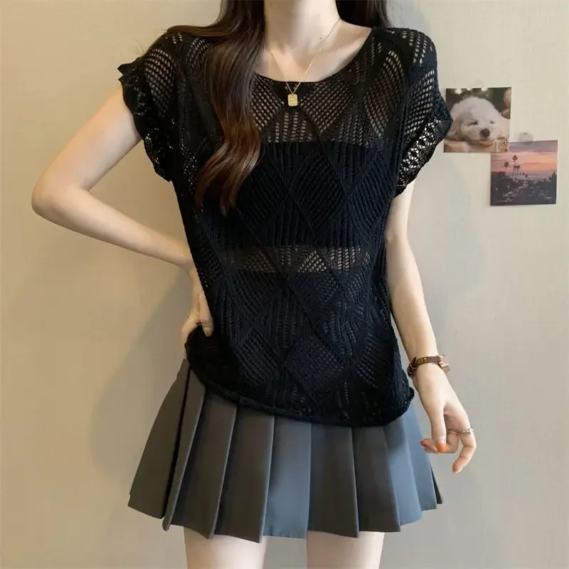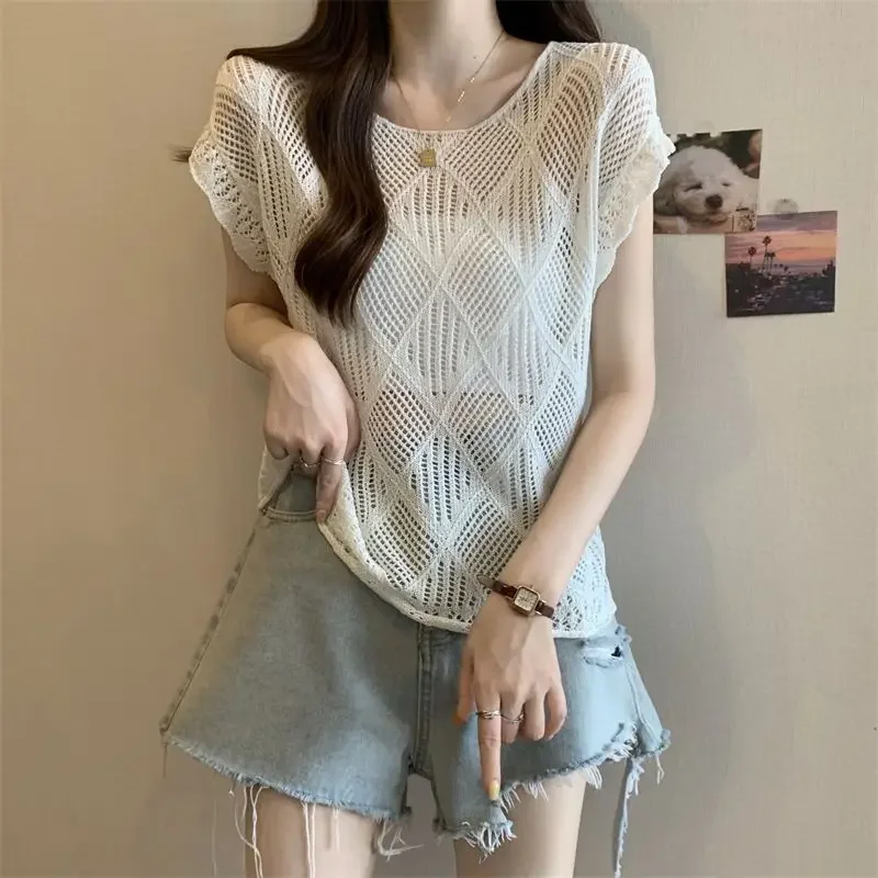 2025 Summer New Hollow Ice Silk Sweater for Women Short-sleeved Shirt with Backless Vests and Thin Tops