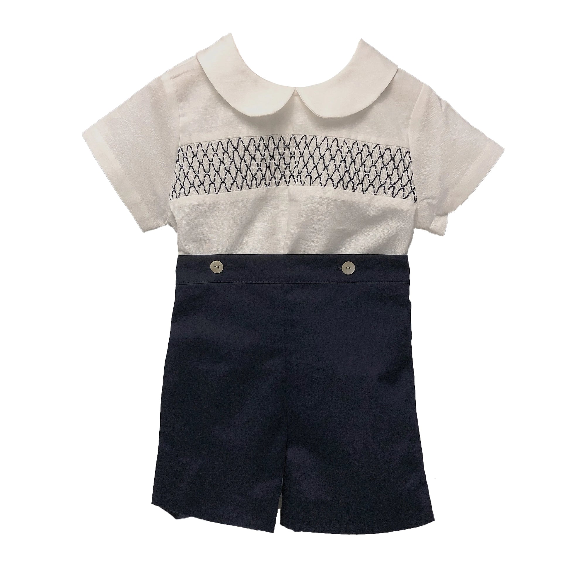 2Pcs Children Boutique Clothing Boy Spanish Smocking Set Cotton Linen Summer Short Sleeves Suit Toddler BABI Outfit Baptism