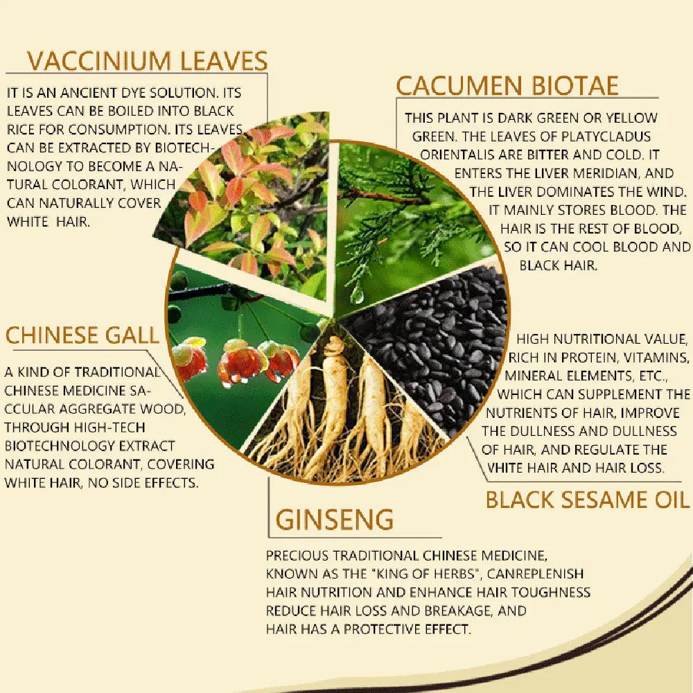 1. This hair dye cream contains various botanical ingredients such as vaccinium leaves, cacumen biotae, chinese gall, black sesame oil, ginseng, which is safe and healthy, easy to color, and easy to clean.