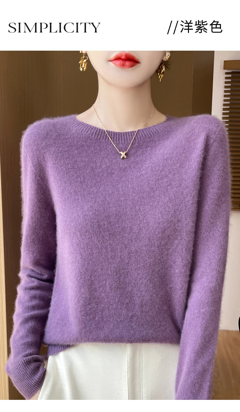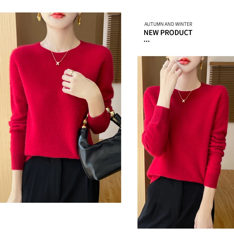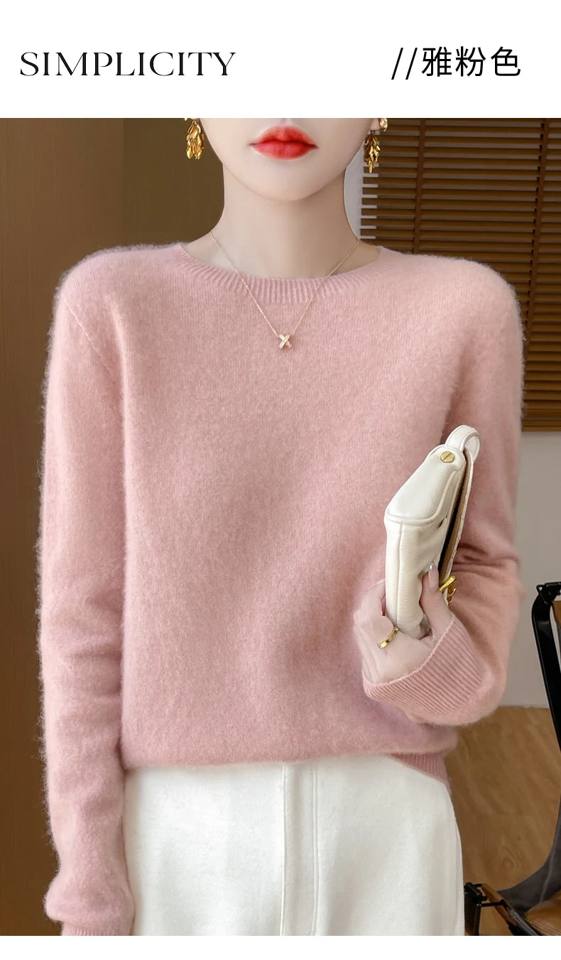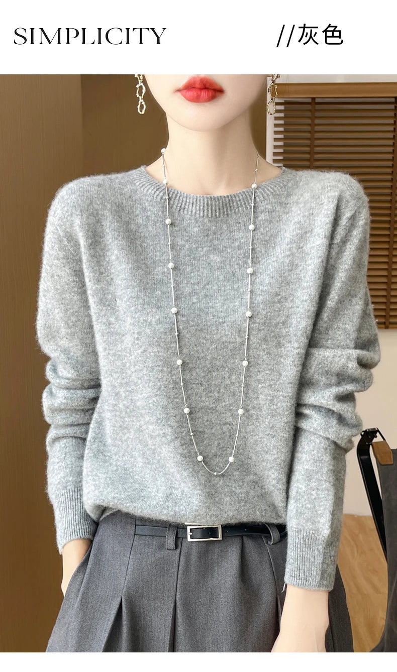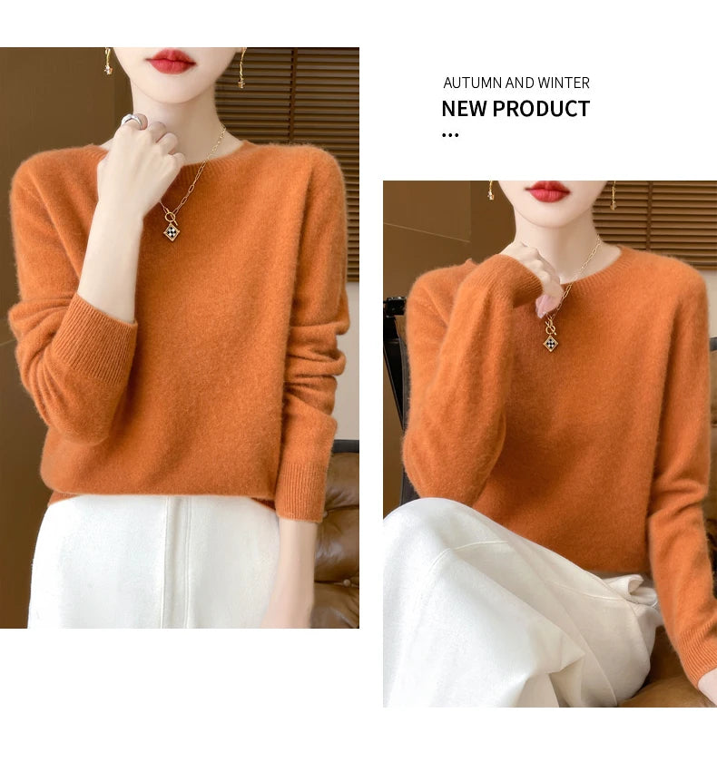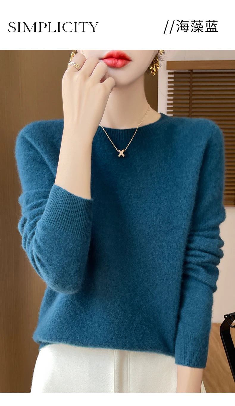 Autumn Winter Women Clothing O-Neck Pullover 100% Merino Wool Sweater New Fashion Cashmere Tops Bottoming Long Sleeve Knitwear