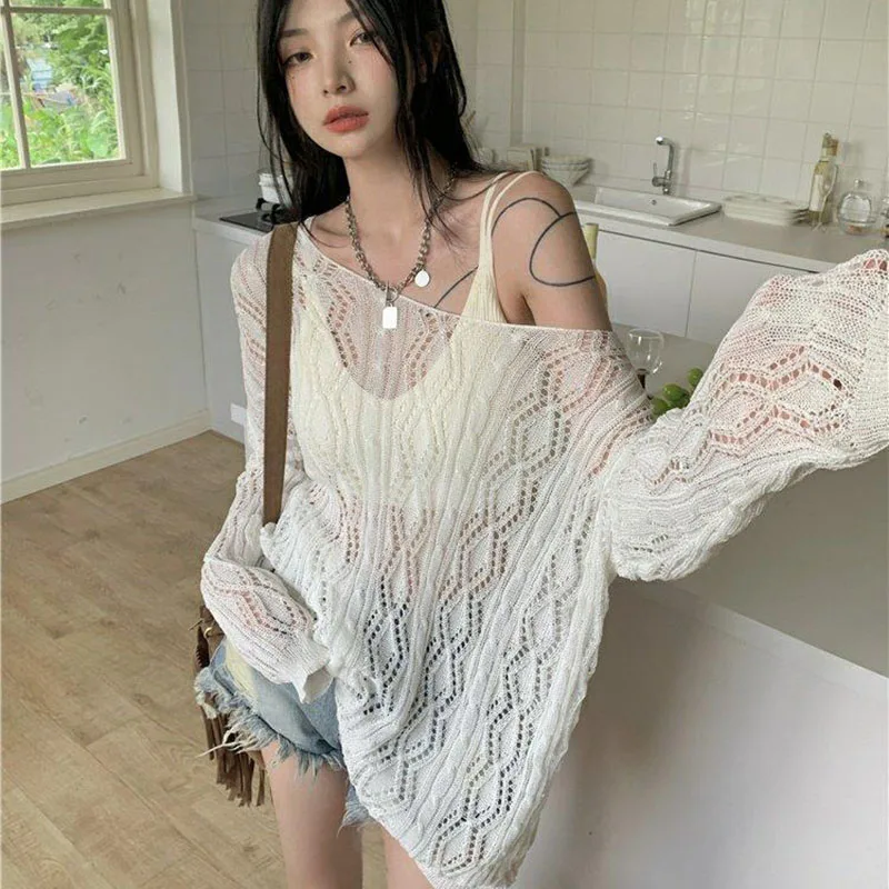 Fashion Two-Sided Wear Knitted Pullover Women Summer Thin Hollow Out Sunscreen Knitwear Woman Streetwear Loose See Through Tops