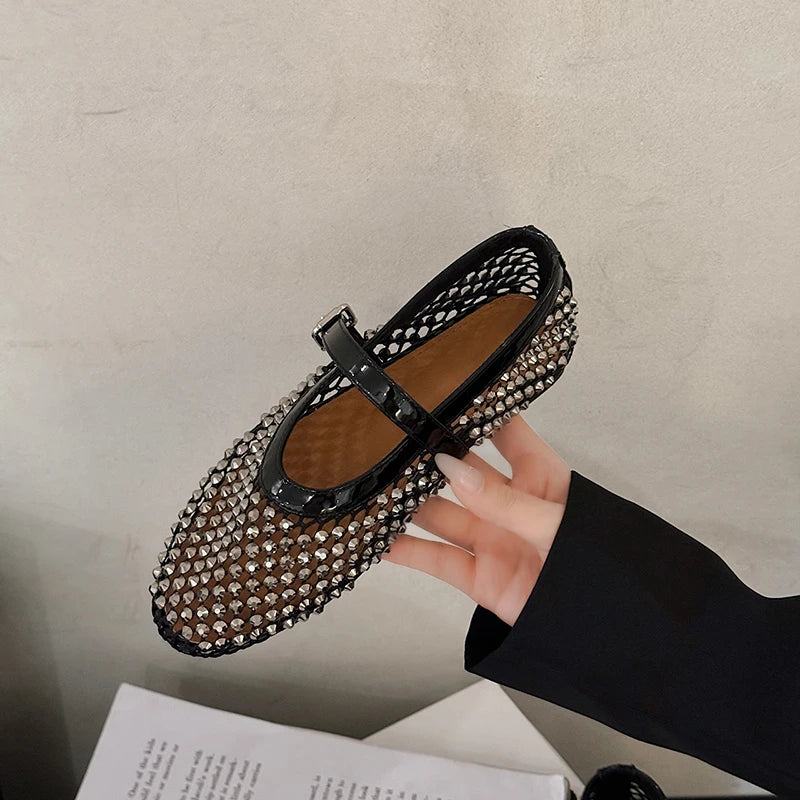 Mesh Breathable Rhinestone Fashion Versatile Women's New Foreign Style Niche Belt Flat Soft Soled Mary Jane Shoes Womens Shoes