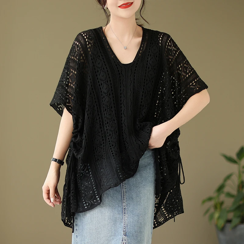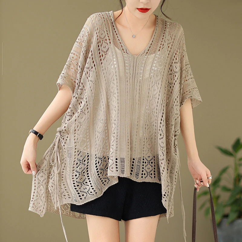 Sheer Crochet Cover Up Tucnic Tops for Women Drawstring Side Openwork Knit Pullover Summer Coverups Boho Beach Vacation Outfit