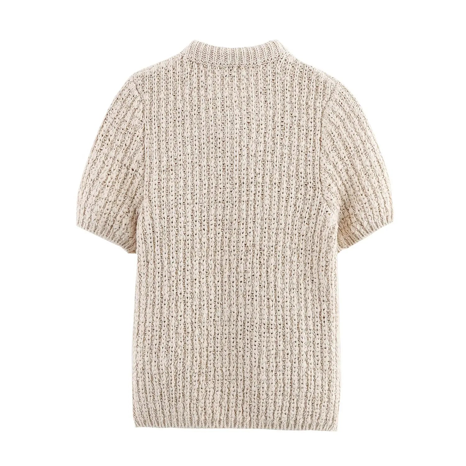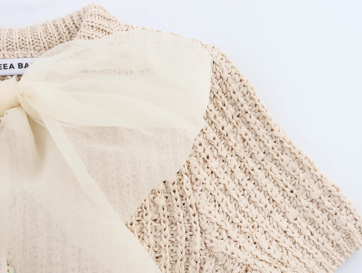 Spring 2025 new women's wear: Sweet transparent tulle bow decorated short-sleeved knitted top