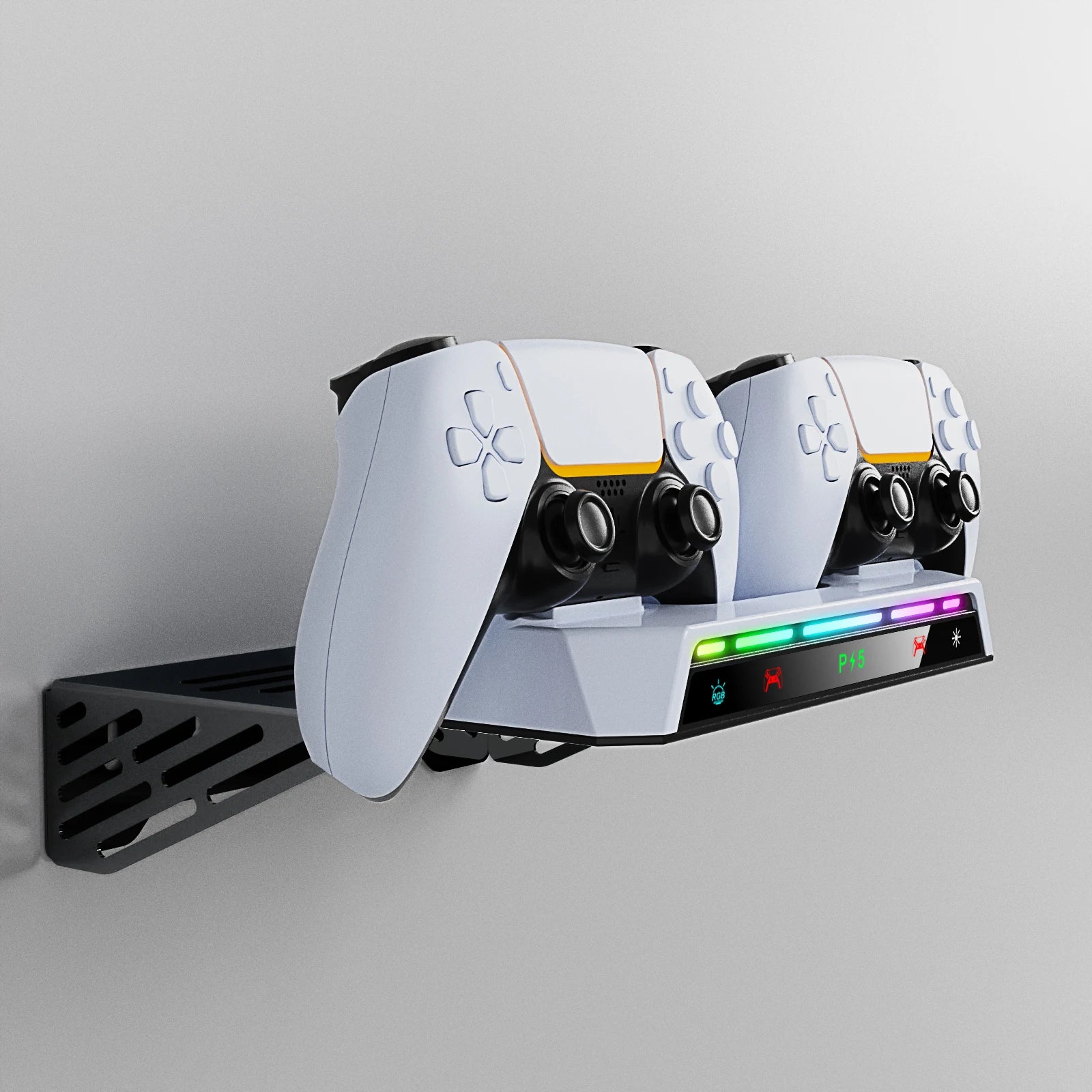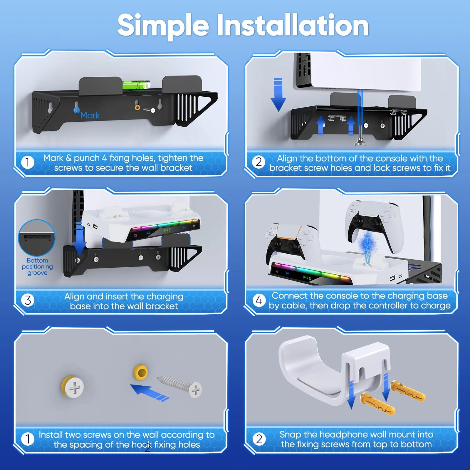 This upgraded wall mount kit is designed for PlayStation 5 / PlayStation 5 Pro / Slim / Original Digital & Discs Edition Console, easy to store your Slim game console and accessories. It comes with dual controller charging station, RGB light strip, headset holder, 3 USB 2.0 Hubs, and LED charging indicator. The all-in-1 design enables multifunctional storage, say goodbye to desktop clutter, one is enough.