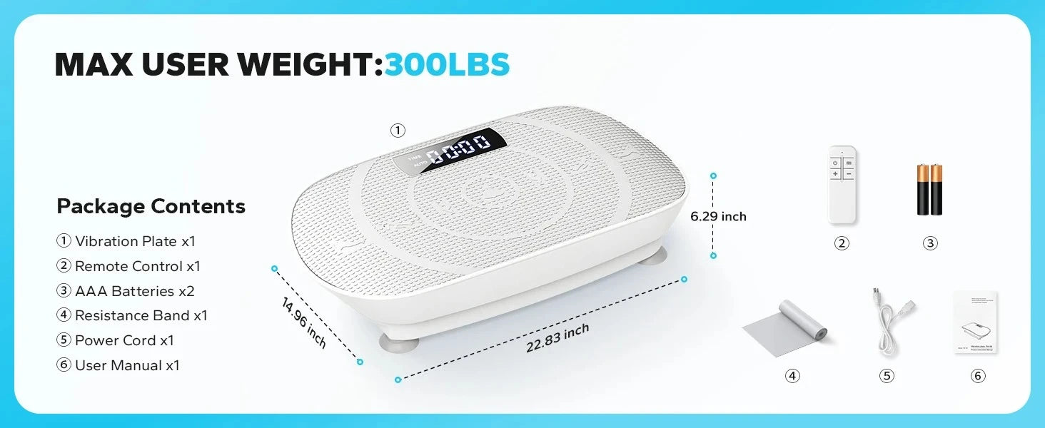 【Excellent Quality, Reliable Guarantee】The bottom four anti-slip suction cups ensure stability of the vibration plate, preventing slipping and reducing exercise noise, ensuring minimal disturbance during workouts, even for sleeping babies. It supports a maximum weight of 300 pounds. If you have any questions about the product's usage, please feel free to contact us!